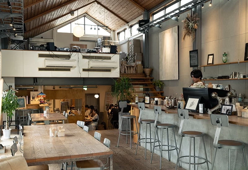 位於昭和町繁華街外、靜謐巷弄中的 「NOQUOI」,是一家擁有高挑天花板、充滿自然光、氛圍開放舒適的咖啡店。店內除了設置兩張大型桌子的 1 樓空間外,最裡層還延伸出半地下式的座位區,形成別具特色的店內動線。