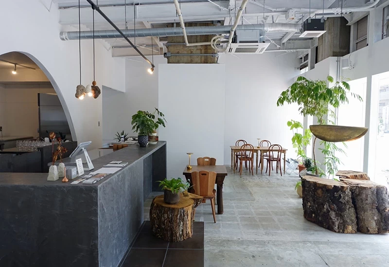 從福山站步行約 3 分鐘即可抵達的高架橋下,坐落著時尚的咖啡館兼藝廊 「&Q」。店鋪以「隱藏於都市背後的文明」為概念,打造出一處脫離日常的咖啡空間,同時也設有不定期舉辦企劃展的藝廊區域。
