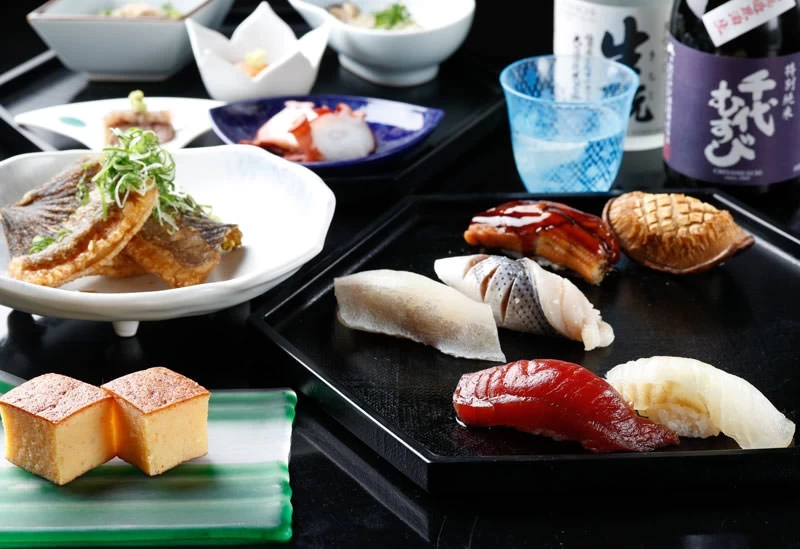 這是一家能品嚐到由曾在銀座「壽司幸本店」磨練 17 年技藝的店主所親手捏製的江戶前壽司的名店。基本為「主廚推薦」的用餐形式,先享用與日本酒相得益彰的 5 款下酒菜,最後再以精緻優美的握壽司作為完美收尾。此外,將 10 種以上的壽司配料與醋飯層層堆疊,最後豪氣灑上自製芝蝦魚鬆的招牌料理「特製散壽司」也是不可錯過的一品,作為伴手禮也非常合適。店內備有吧檯座位與包廂,無論是成熟的大人約會,還是商務接待都能靈活利用。不妨親自品嚐看看這份承襲名店技藝、以及嗜酒店主所打造出的絕妙酒肴吧。