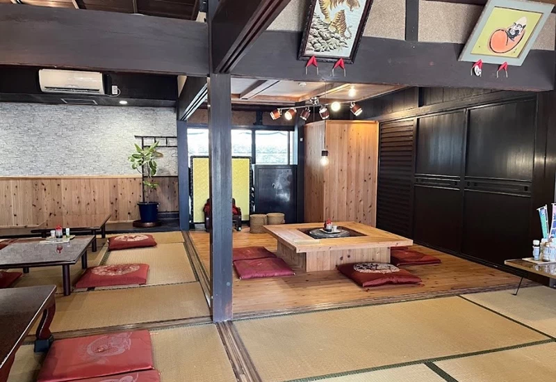 店內提供牛排、壽喜燒、漢堡排等多種以近江牛製成的料理,每到秋季,更能品嘗到松茸與近江牛的奢華組合。整體空間以松木屋梁、圍爐、川床等元素打造,保留濃厚的和風質感,所有陶器與花器皆由店主親手創作。通往二樓包廂的走道更有如京都巷弄般的雅致氛圍,十分適合成熟高雅約會,營造專屬於兩人的特別時光。