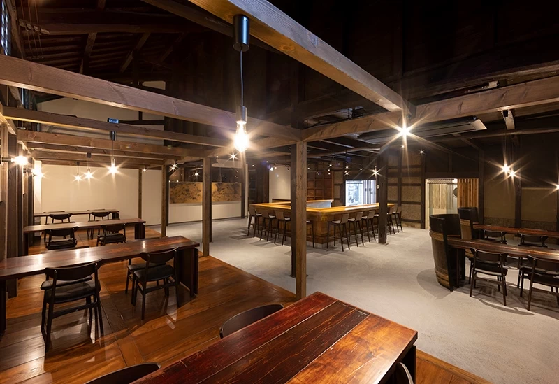 從近江鐵道本線愛知川站步行約 15 分鐘即可抵達,由創業於 1831 年的酒造「藤居本家」經營的「かくれ蔵 藤居」。餐廳坐落於大正時代建造、被列為登錄有形文化財的酒藏內,並在保留土牆、天花等酒藏原貌的同時,融入以櫸木整片木板打造的吧台席、以酒桶改造的座席等設計,營造出精緻優雅的氛圍。