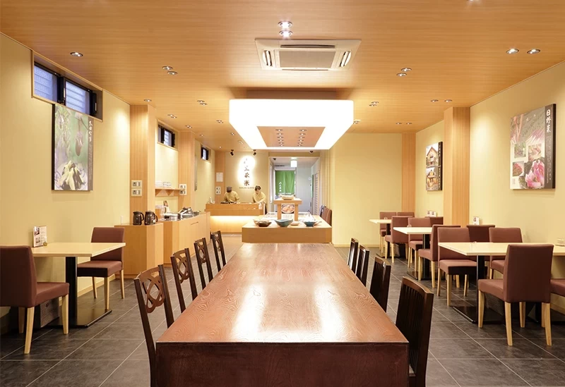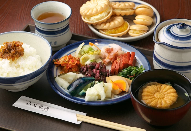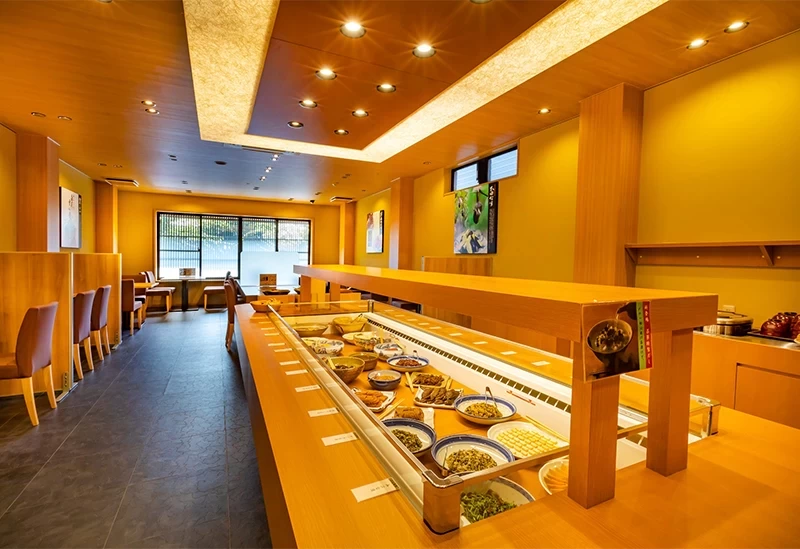 從名神高速公路彥根交流道開車約10分鐘,即可抵達坐落於充滿城下町風情街道上的「近江漬物自助 山上茶寮」。這裡由擁有八十多年歷史的漬物專門老店「山上」所經營,是以漬物吃到飽聞名的人氣名所。店內陳列著約二十種使用近江在地蔬菜醃製的漬物,保留食材原味、呈現出道地的近江傳統風味。搭配近江米與各式漬物、佐料,再淋上熱騰騰的特製高湯所製成的「茶泡飯風」吃法,更是此店獨有的特色。餐具採用滋賀傳統工藝「下田燒」,讓人能同時透過味覺與視覺,盡情感受當地的文化與美味。