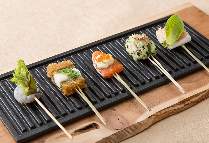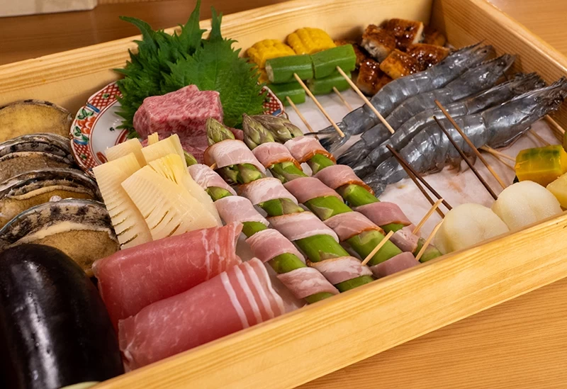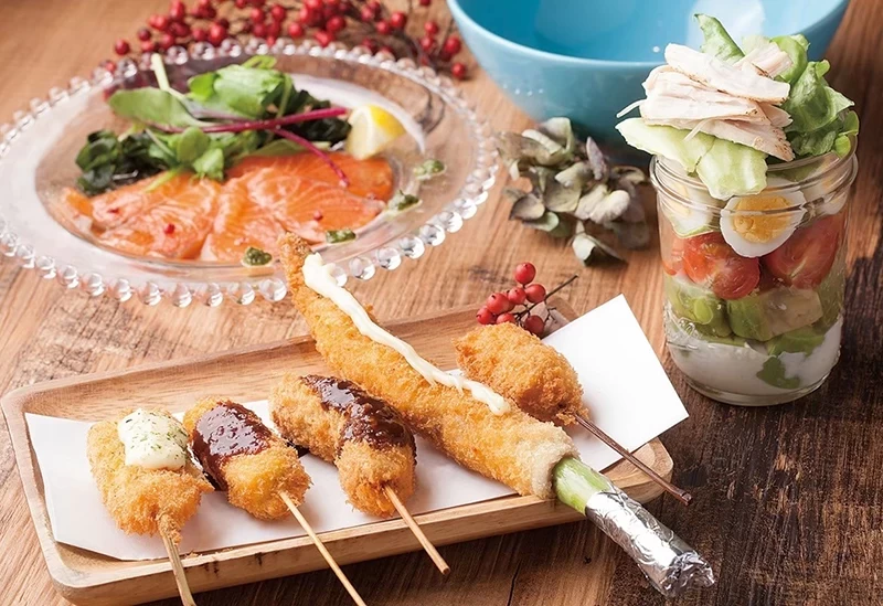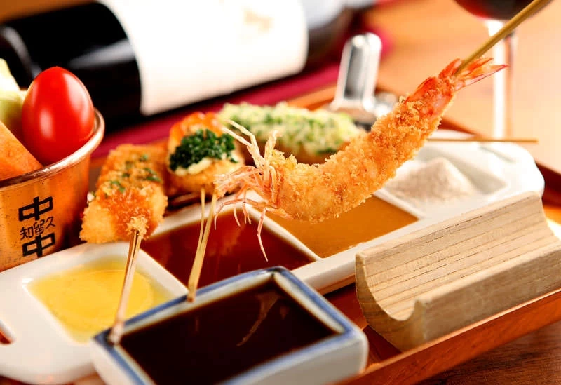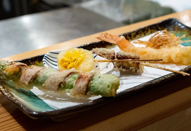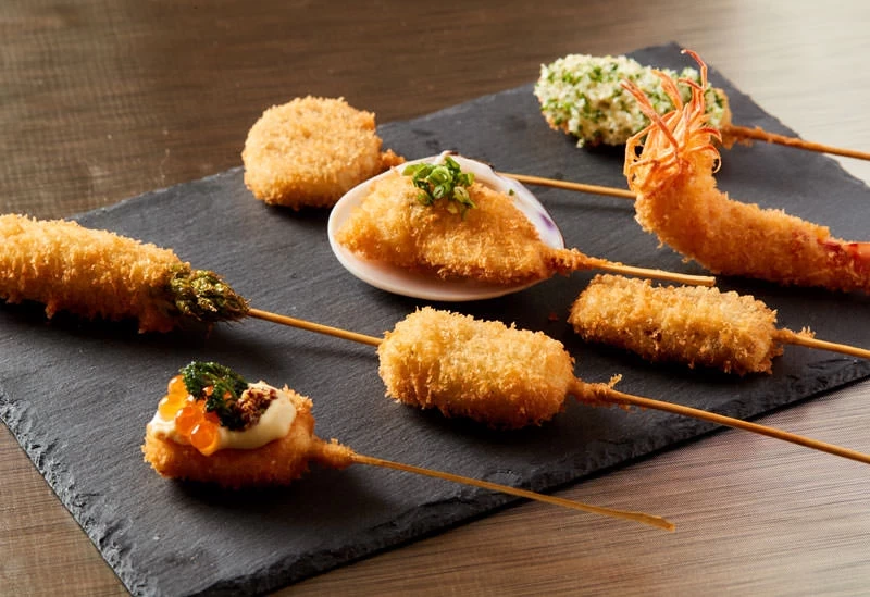其中最受歡迎的名物料理,就是據說由本店發源的「主廚無菜單串炸套餐」。店內準備了 30 種以上使用時令食材製作的串炸,並以現炸現上的方式逐一道上桌,最後依照吃了多少串、吃了哪些品項來計價。餐盤上會附上多種醬料和鹽,能依個人口味調整風味,也是品嚐時的樂趣之一。只要不說「停」,店家就會持續上新串,能依照自己的步調盡情享受當季滋味。