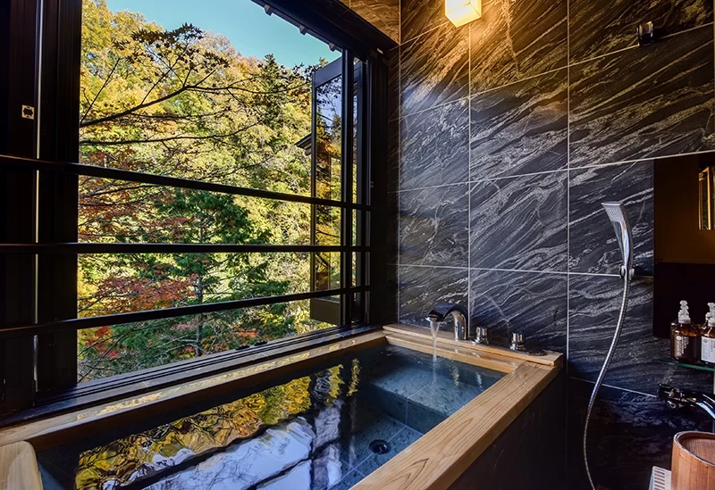 若想兩人一起享受「宅在旅宿」的約會時光,這裡是不二之選。這間歷史悠久的溫泉旅宿,交誼廳內收藏約 3 萬冊藏書,可一邊小酌美酒,一邊深入閱讀,細細感受蓼科的歷史風情,度過悠閒時光。館內還設有腳下便是瀑布流淌的露天溫泉,以及被溪谷絕景環繞的私人露天湯屋,讓人盡情享受泡湯樂趣。享受完溫泉後,還能品嚐到選用信州在地發酵食品入菜、健康且精緻的「和式法餐」。