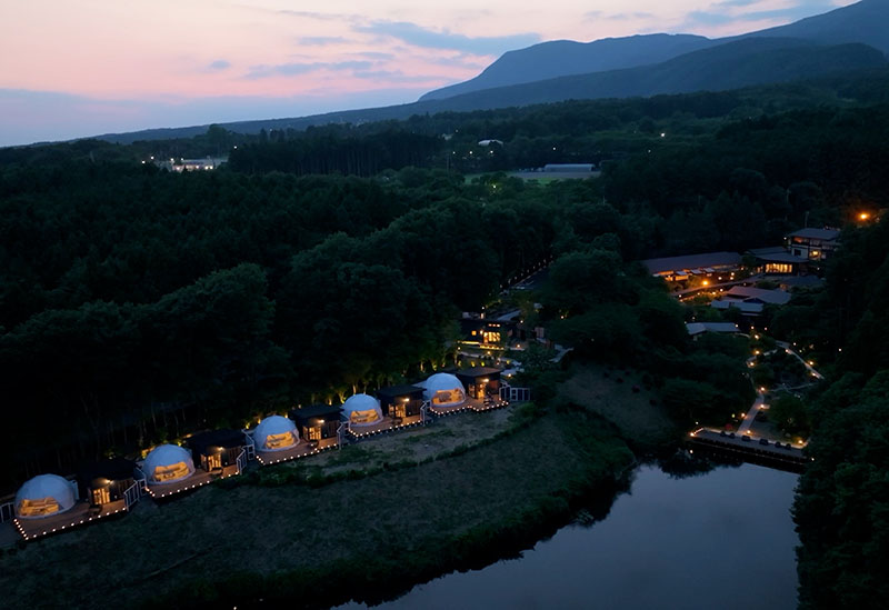 位於群馬縣前橋市・赤城山南麓森林中的「水與風與月」。其名稱包含著希望在被自然氣息環繞的絕景中享受豪華露營的願望。為了實現成人的高品質休憩,客房僅限5間,並奢侈地確保每棟建築的用地面積。所有建築並排配置,設計出高度私密性的空間。從圓頂帳篷內的餐廳與浴室可一覽美景,這也是令人愉快的重點。沉浸於所有客房備有的半露天浴池中,盡情享受遠離日常的療癒時光。
