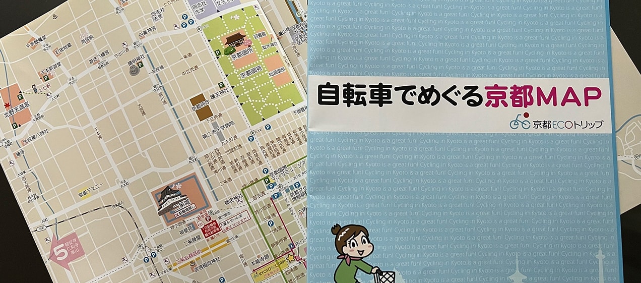 每組贈送1本自行車觀光用的京都地圖。包含廣域地圖,記載有行車管制區域、公廁位置等的詳細地圖,以及停車場的使用方法。還能確認各區域間的所需時間,非常方便安排旅遊計畫。
