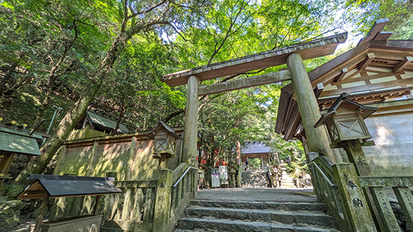 多度山山麓的地形與神殿的配置巧妙融合,營造出靜謐且莊嚴的氛圍。主殿位於神體山腳下的斜坡上,地勢錯落形成立體感,構成神聖莊重的景觀。順著參道而行,時而可見展望視野開闊之處,也有轉角處突現的小空間與拍照景點等,處處充滿魅力。對於對建築、信仰、自然感興趣者,以及熱愛攝影者而言,這裡都是不可錯過的寶貴風景所在。