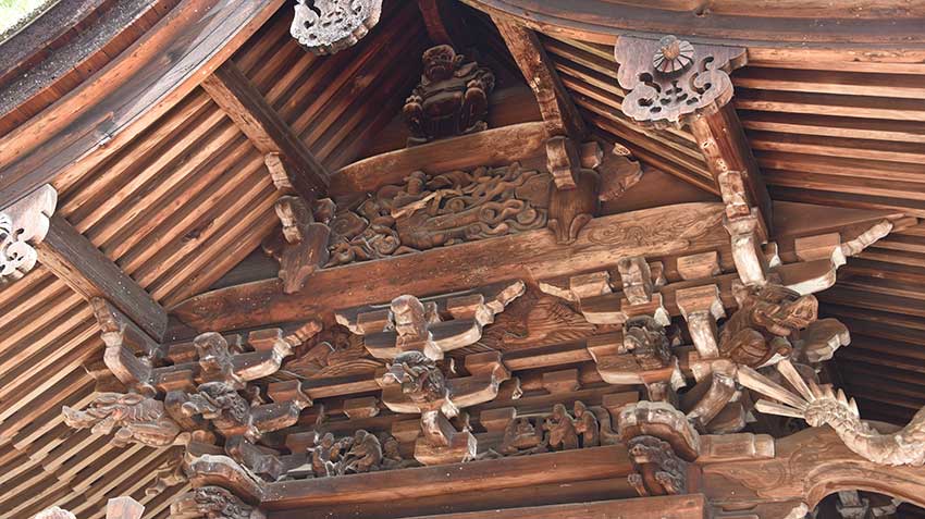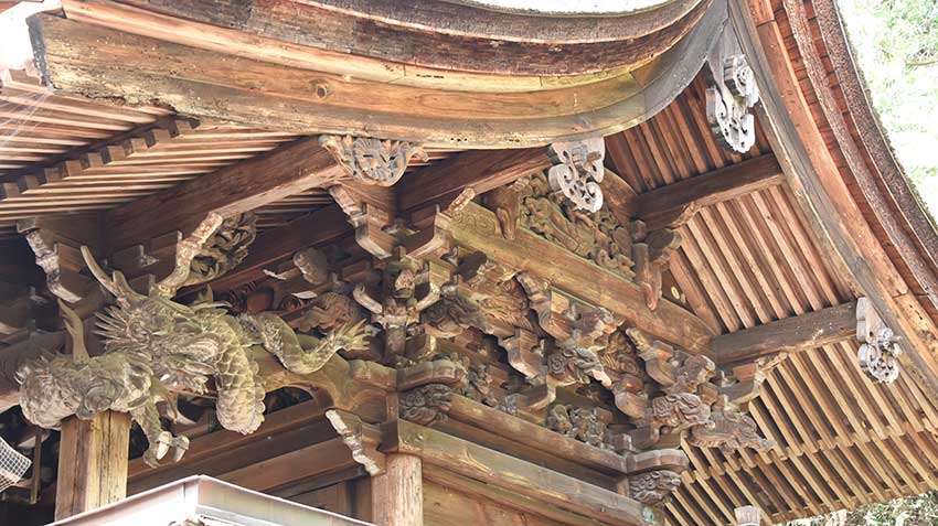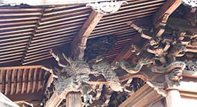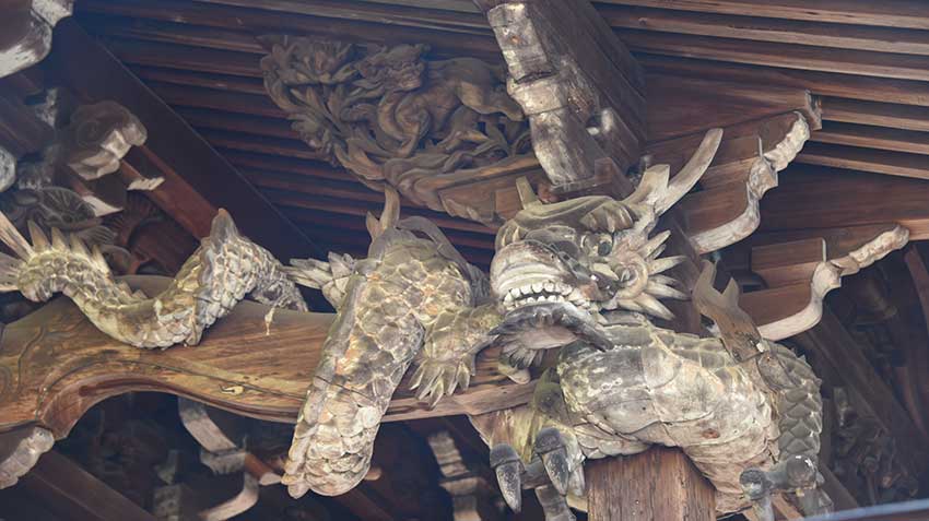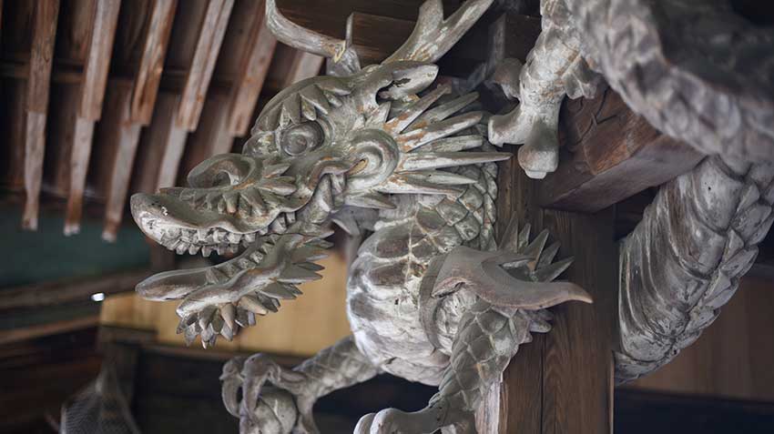 本殿屋簷下氣勢磅礡的龍雕,絕對值得一看。虹梁兩端雕有神情銳利的龍頭,龍的軀體與四肢更緊緊盤繞在海老虹梁之上。雖然顏色已隨歲月褪去,仍可看出曾經的華麗色彩,這些歷經風霜的雕刻更增添了歲月之美。關於這對龍雕,還流傳著一則傳說。據說有位老人因田地被破壞而前往手力雄神社參拜,卻在井邊遇見一條龍。他將此事告訴村民後引起騷動,眾人一同來到神社,發現本殿的木雕龍身竟然濕潤,並注意到其中一條龍原本握著的寶珠消失了。此後村裡的田地仍不斷被破壞,並且發現龍的寶珠位置每天都不一樣,於是便向神主請示。最後據說為了讓龍不再外出作亂,人們在龍的眼睛上釘下釘子。雖然現存的雕刻並沒有釘在眼睛上,但據說木雕內部的隱藏部分確實是用大釘子固定住的。如今神社也提供與龍之力量相關的授予品,讓參拜者能帶回象徵龍神庇佑的守護之物。