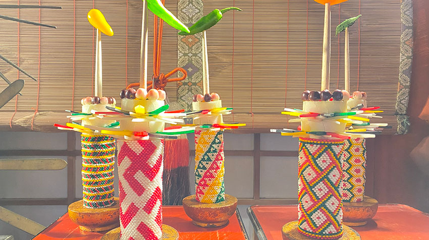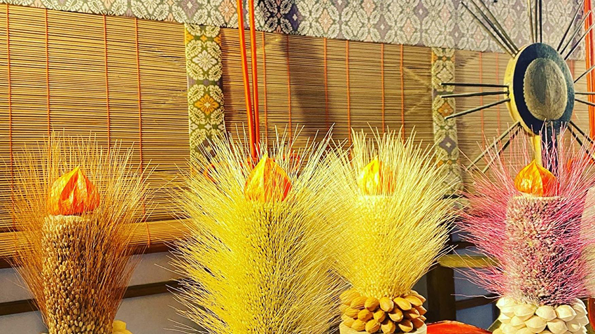 每年秋天舉行的「嘉吉祭」,是自室町時代流傳下來的傳統神事。祭典中會以多武峰所產的秋季收穫物,由神職與氏子精心製作出色彩繽紛、工整雅致的供饌──「百味御食」,獻予神明,祈求五穀豐登與天下太平。其由來可追溯至1435年(永享7年),南北朝合一之後,南朝遺臣在奈良縣多武峰舉兵據守,導致此地陷入戰火。當時,為避兵火而暫時移奉至飛鳥(今明日香村)橘寺的御神體,於1441年(嘉吉元年)平安歸回多武峰。人們因欣喜而奉上收穫物祭謝,遂成為「嘉吉祭」的起源。如今祭典中所供奉的「百味御食」,以染色糯米、穀物、果實、蔬菜等精緻擺盤而成,被指定為奈良縣無形民俗文化財。
