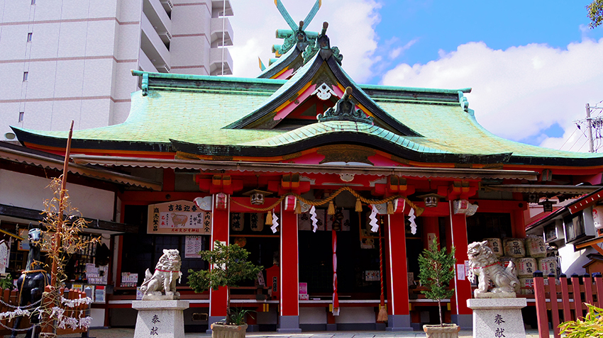 1959年(昭和34年)整建完成的社殿,氣度高雅,承載著古老的傳統與歷史。境內可前往別院「高寶院稻荷」祈求,據說能將一個願望傳達給稻荷神;還有被稱為「幸福惠比壽」的石造惠比壽像,庇佑人們幸福;賜予勝負運與自我超越力量的神馬像「勝馬」;據說觸摸便能帶來好運的「月像石」;以及拂摸便能祈求開運招福與病癒的「招手兔」。雖身處市區,境內卻寧靜肅然,讓人能感受與神明的連結。作為神社象徵的朱紅大鳥居高達約17公尺,矗立於拜殿前,甚至能從阪神電車車窗望見,氣勢磅礡地迎接參拜者。