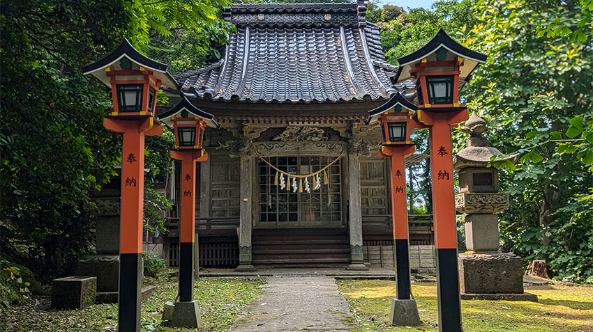 被森林靜謐氣息包圍的社殿,雖規模不大,卻能感受到其歷史意義與深厚的信仰力量。社殿前有狛犬守護,向拝正面的木鼻雕刻著龍、獅子、象等圖案,細緻精美。來自全國的參拜者前來祈求求子與安產,並舉行祈禱儀式,社殿內奉納著安產祈願的千羽鶴,也是這裡的一大特色。此地流傳著源義經嫡子誕生的傳說,自創建以來歷經時代變遷,仍被人們視為神聖之所,持續受到虔誠信仰。主祭神為主管安產與育兒的息長足姬尊,配祀神有譽田別命、高龗神與建御名方命。通往社殿的參道兩旁矗立著參天巨木,讓前來參拜的人在寧靜與莊嚴的氛圍中感受到心靈的平和。