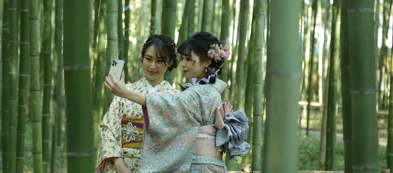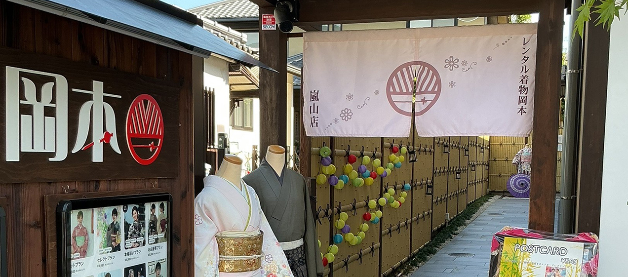 位於從京福電氣鐵道嵐山站步行約5分鐘、JR嵯峨嵐山站步行約7分鐘的地點,正對著竹林之道佇立的「レンタル着物岡本 嵐山店」。該店誕生於希望讓男女老少都能親近和服,成為可穿著和服享受觀光景點的“觀光租借和服店”先驅之一,由創業逾190年的老字號織物店製作,無論是搭配、確實的穿著技巧或髮型設計等充實的附加服務都深受好評。希望與重要的人一起穿著和服,享受風情萬種的京都街道散策。
