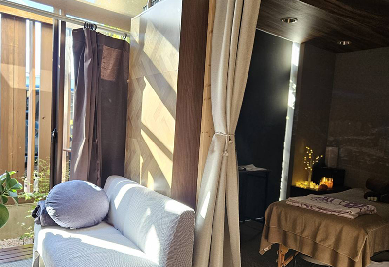 岩盤浴的床面使用具有遠紅外線和負離子的效果,能從身體內部徹底加熱的天然礦石黑矽石。此外,在精油淋巴護理療程中,也很有吸引力的是,根據希望提供訂製的精油。