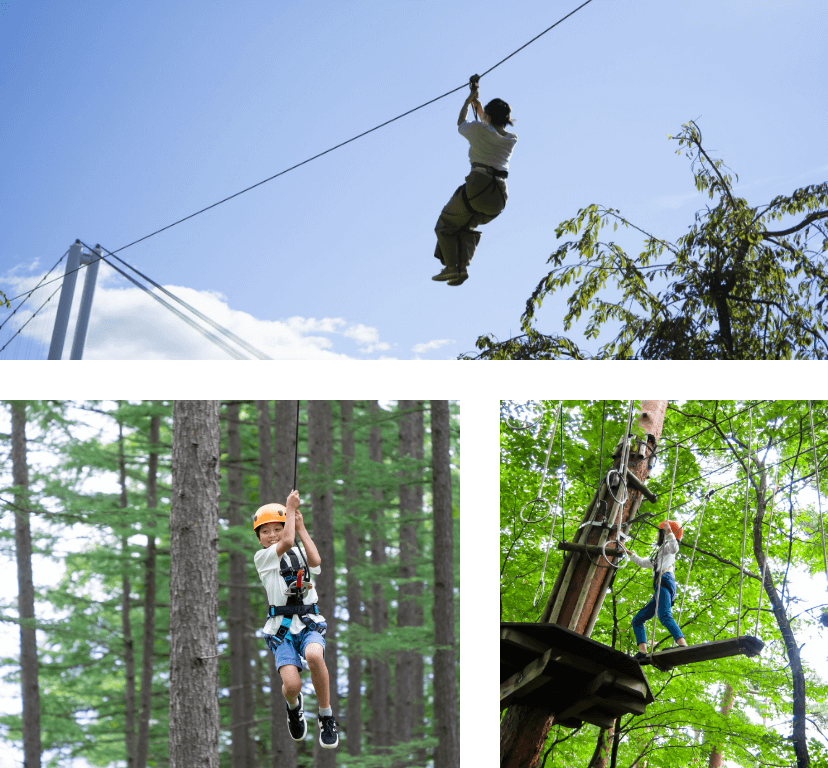 所謂的野外運動冒險,是利用自然地形與樹木打造遊具的冒險樂園。踩著圓木行走、借助繩索移動、從大型溜滑梯滑下……能在森林中盡情奔馳,這正是野外運動冒險的精髓。多數設施都設有數條不同路線,不會玩膩,可以一次又一次挑戰。快來嘗試各種路線,向終點邁進吧!