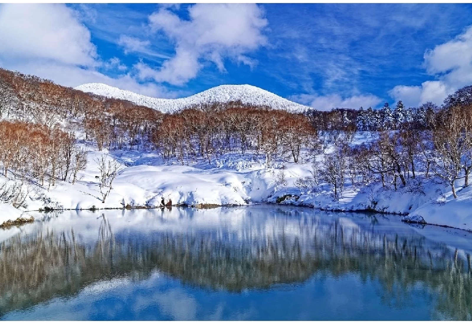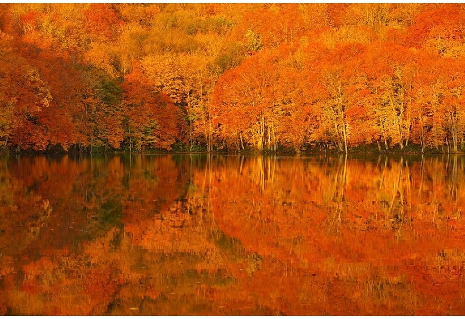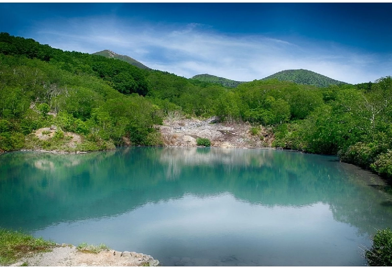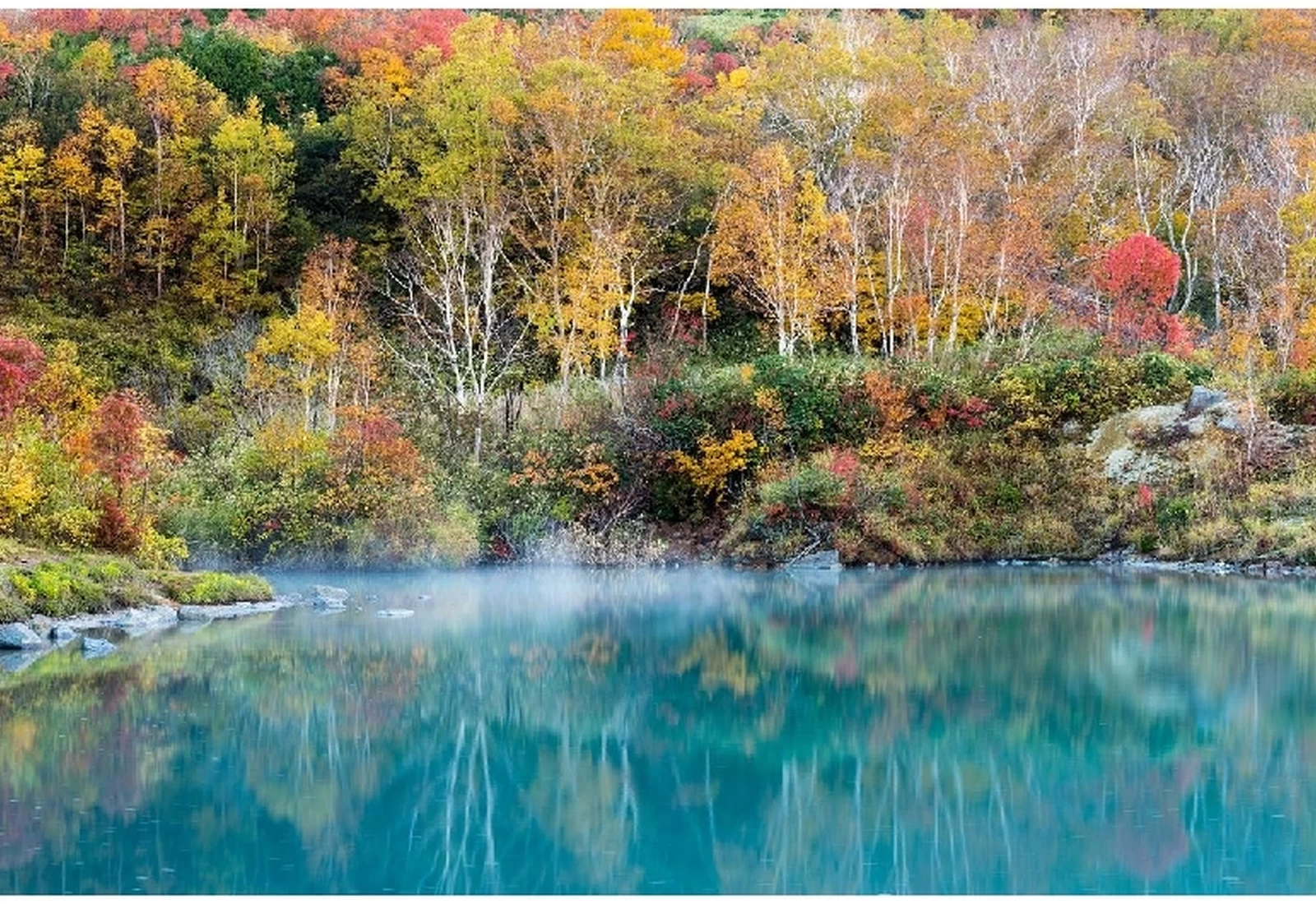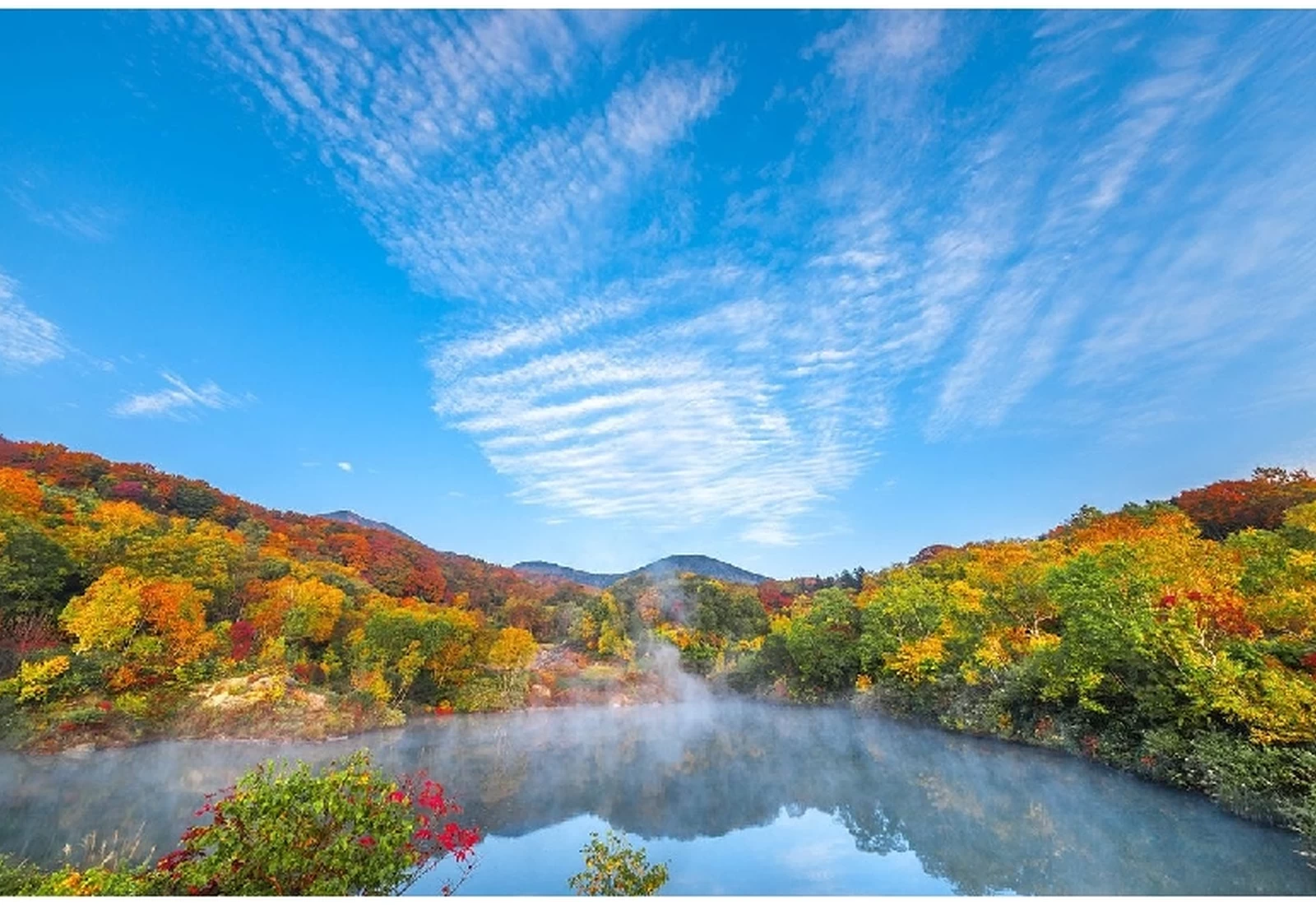 「地獄沼」是由八甲田山火山爆發所形成的火口湖,湖水因周圍湧出的溫泉而聚成。泉溫高達約90度,即使至今仍可見含硫氣體與熱泉不斷冒出。沼畔環繞著壯闊的八甲田山群,四季變化各有風情。每年10月中旬紅葉最盛時,湖面周圍的樹木染上鮮紅與金黃,與帶有翠綠色澤的湖水交織成如畫般的美景,讓人彷彿置身於一幅秋日的油畫之中。