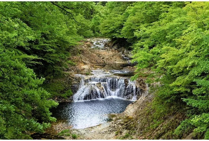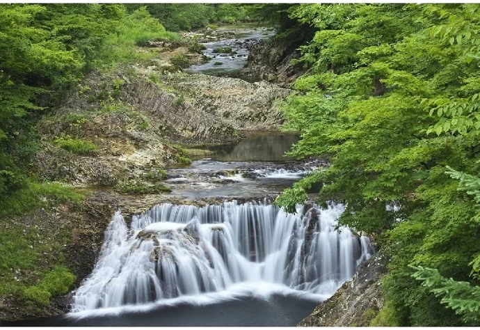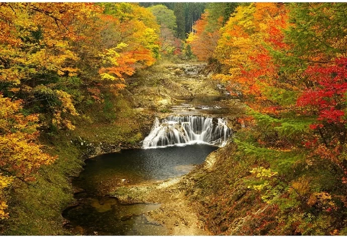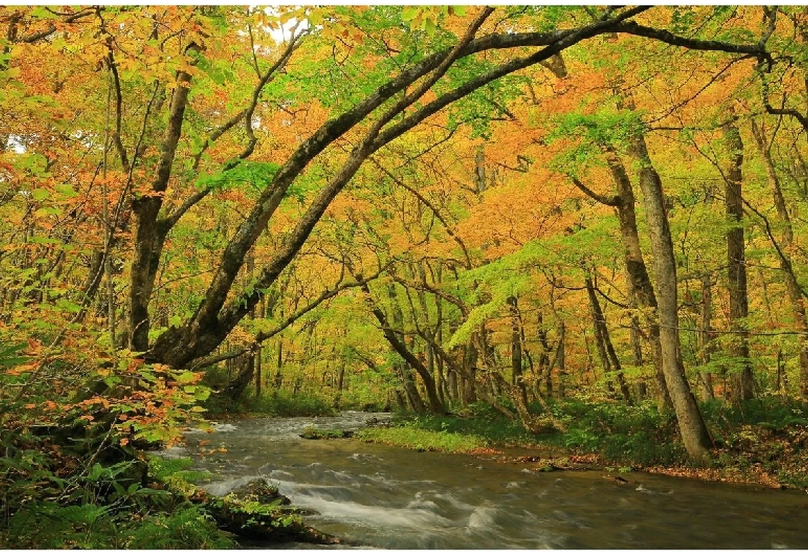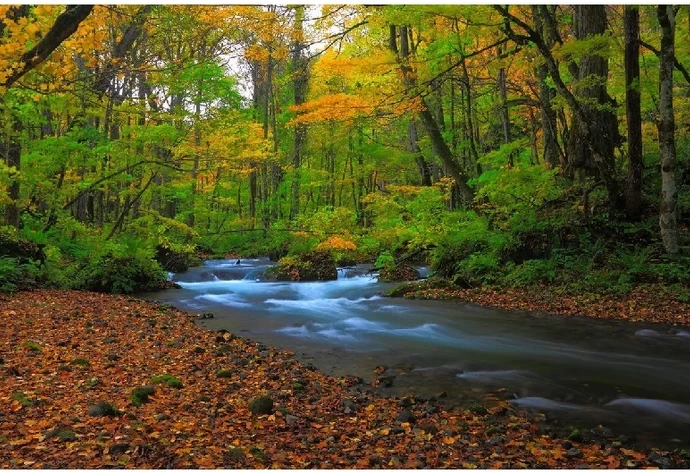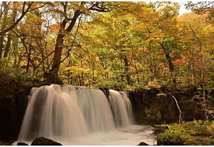 「奧入瀨溪流」以其壯麗的自然溪谷美景聞名,是日本東北地區最具代表性的風景名勝之一。這條溪流由十和田湖火山活動引發的大洪水侵蝕台地而形成,沿途設有步道與車道,無論開車或散步都能欣賞到如詩如畫的風光。高聳樹林形成的綠色隧道、飛瀑湧泉與清澈溪水交織出令人驚嘆的景色。每年十月下旬是紅葉最迷人的季節,金紅交織的樹影映照在溪流上,令人仿佛置身童話般的世界。