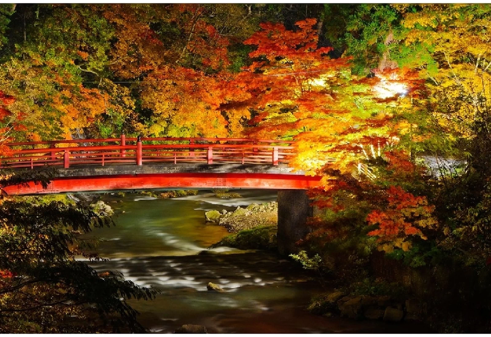 「中野紅葉山(中野神社)」是青森縣最具代表性的賞楓名所之一,園內約有 130 棵樹齡超過百年的楓樹。每年 10 月中旬至 11 月上旬為紅葉盛開期,屆時會舉辦限定的夜間點燈活動。被燈光映照的楓葉在夜色中閃耀如夢境,令人屏息。地面鋪滿如地毯般的落葉,搭配紅橋上的絕景視角,構成如詩如畫的秋日風情。無論白天或夜晚,都能盡情沉浸在這片繽紛的紅葉世界中。