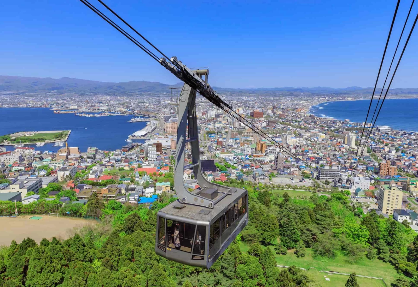 可容納 125 人的車廂設計開闊、窗面寬大,視野相當出色。隨著高度逐漸上升,函館的街景、教會群、津輕海峽與函館灣等風景,會以不同於山頂的角度映入眼簾,這正是搭乘纜車時才能體驗到的迷人魅力。