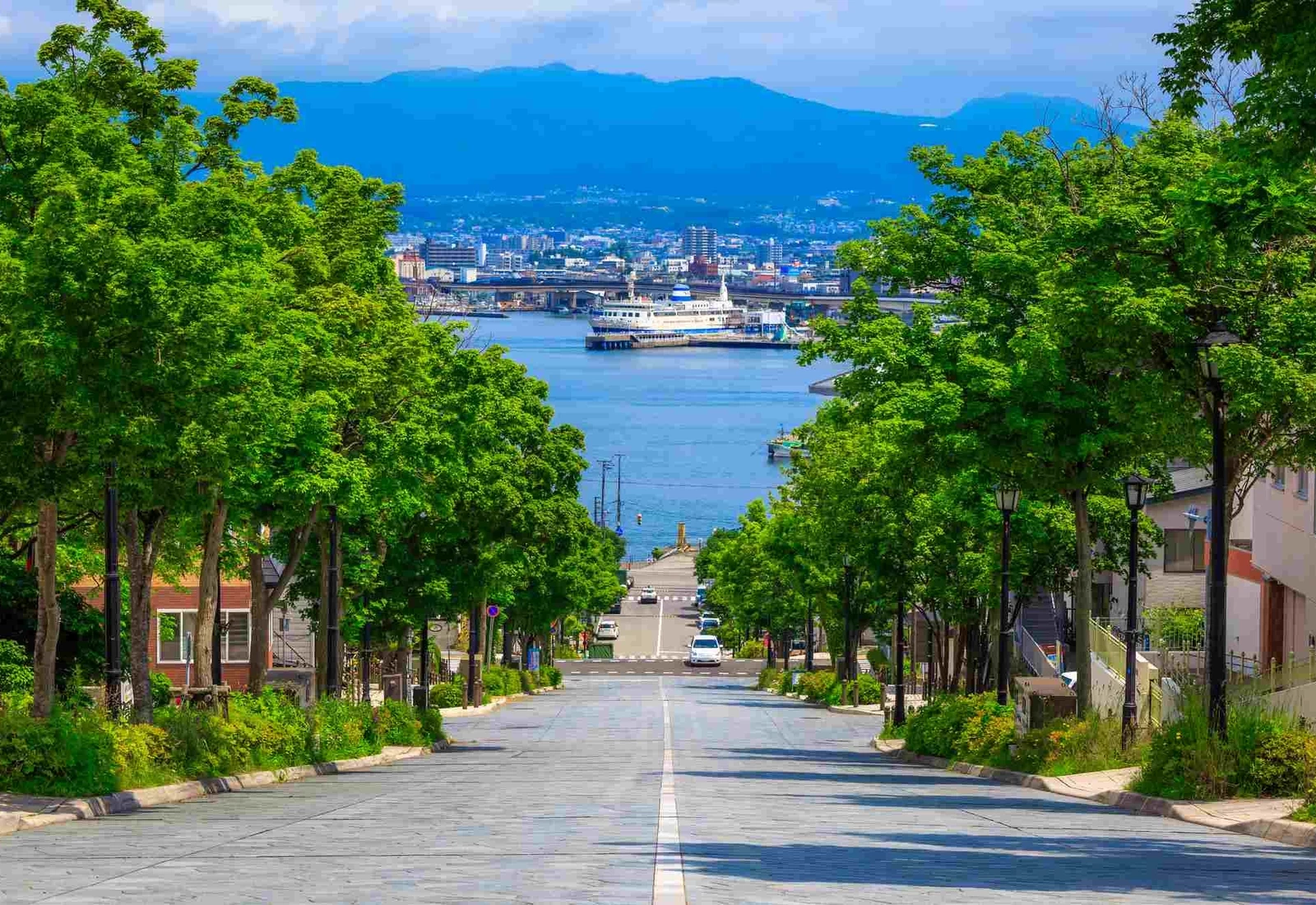 從坂道上方望去,函館灣的遼闊景色與兩側整齊的行道樹相互映襯,畫面相當迷人,天氣好時還能遠遠看到紀念船摩周丸。雖然坡度略陡,但人行道旁設有附扶手的階梯,整體規劃完善,慢慢走也能安心享受沿途風景。