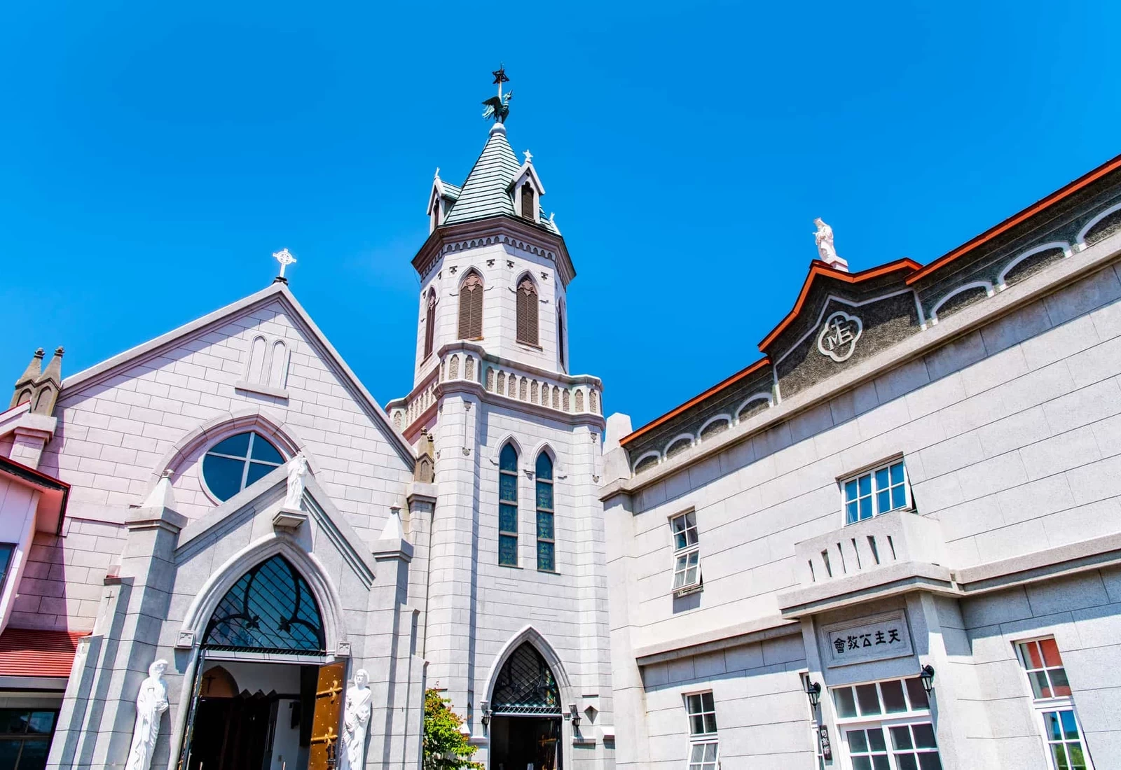 作為元町代表性風景而廣為人知的「元町天主教堂」,紅色屋頂與白色牆面形成鮮明對比,格外優美;以 12 世紀哥德式建築風格為特色的尖頂大鐘樓,更是令人印象深刻。教堂的起源可追溯至江戶時代末期,由法國傳教士梅爾梅・德・卡雄所建的臨時聖堂。