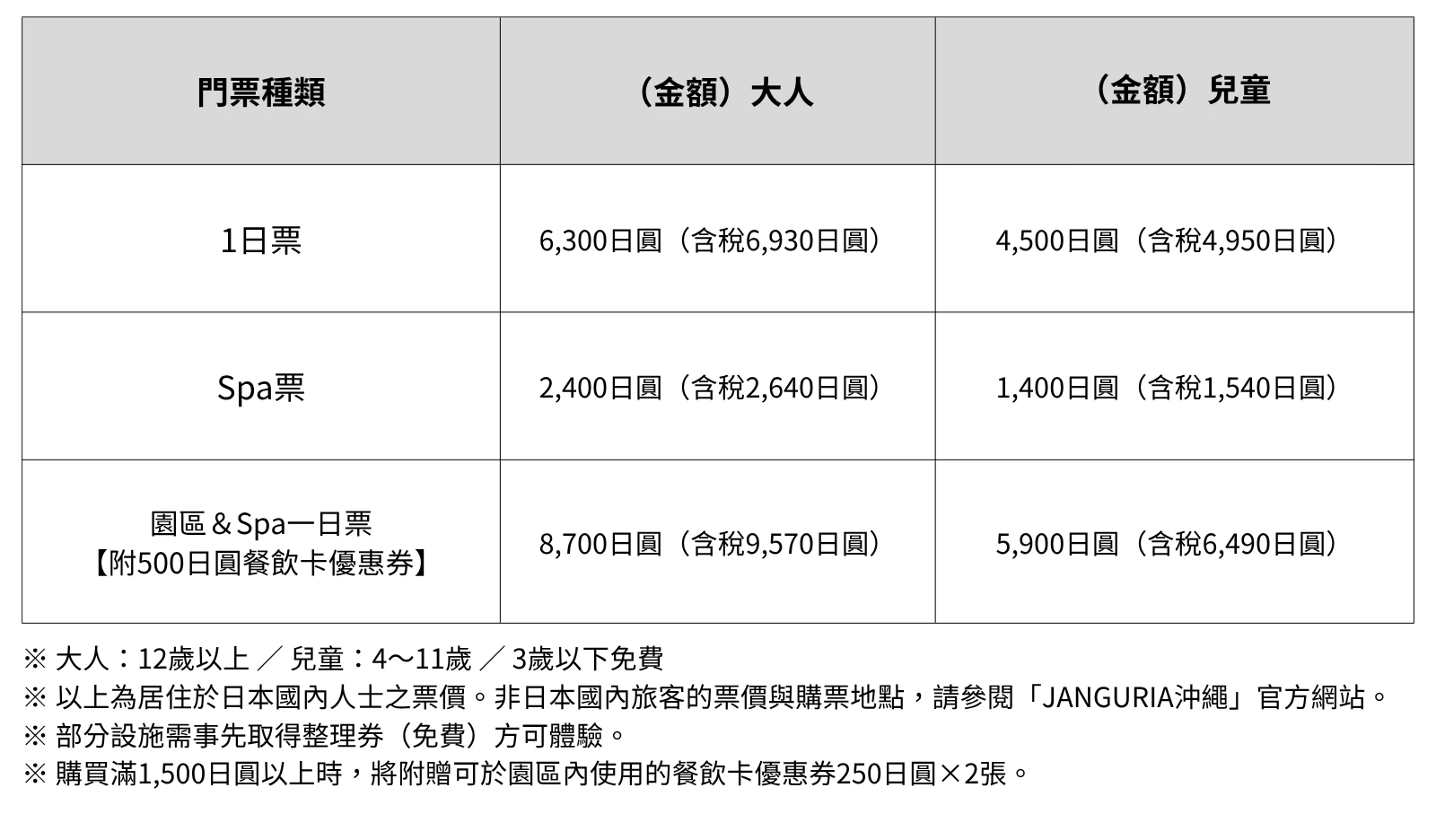 進入「JANGURIA沖繩」需要購買以下任一票券:「1日券」、「SPA券」或「樂園&SPA 1日券」。