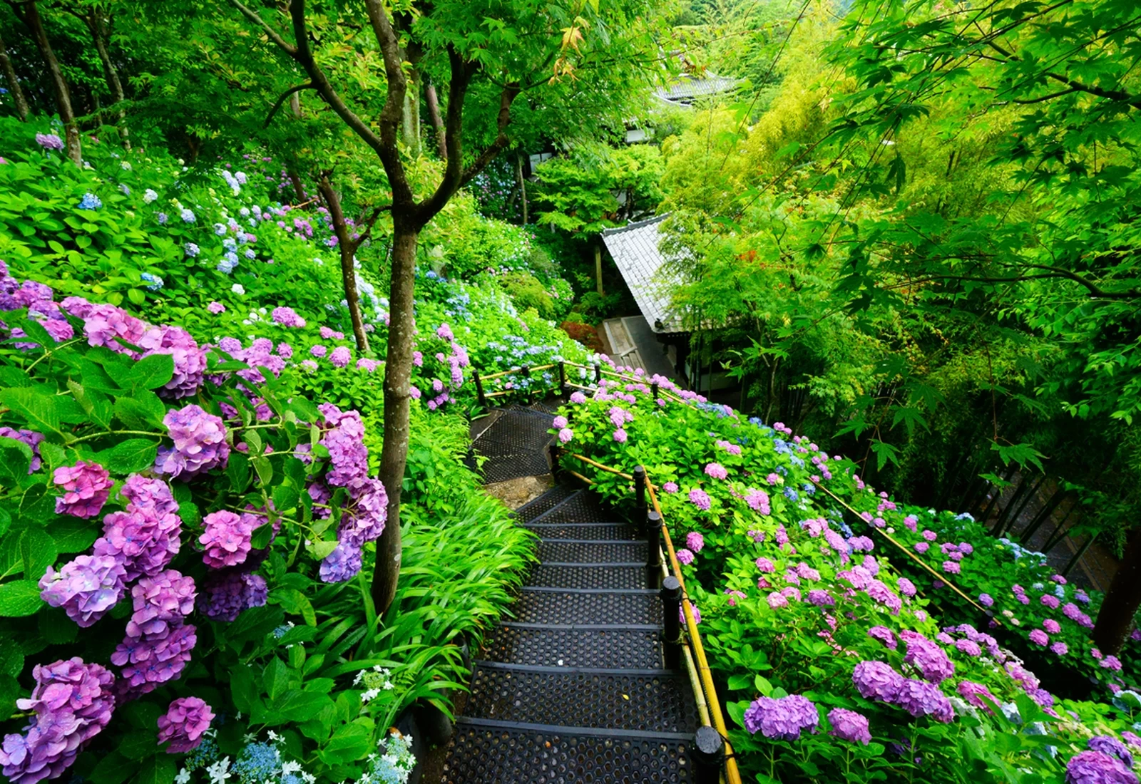 「報國寺」是一座隸屬於臨濟宗建長寺派的禪寺,曾作為足利家與上杉家的菩提寺而繁盛一時。沿著參道前行,可見以苔蘚與岩石巧妙構成的「枯山水庭園」,莊嚴靜謐的氛圍中流露出淡雅風情,令人不自覺放慢腳步。其中最受歡迎的,莫過於寺內的竹林景致。約 2,000 株孟宗竹筆直挺立、連綿成林,交織出壯觀又夢幻的畫面。若散步途中感到些許疲憊,不妨前往竹林深處的抹茶處小歇片刻,一邊品嚐抹茶與和菓子,一邊享受靜靜流動的悠閒時光。