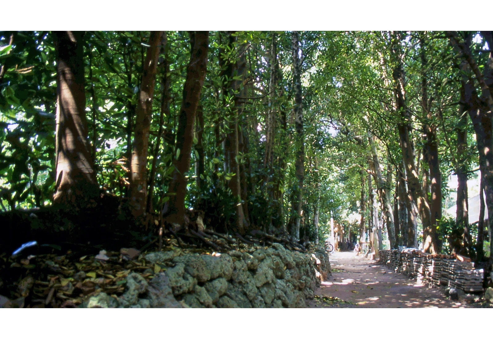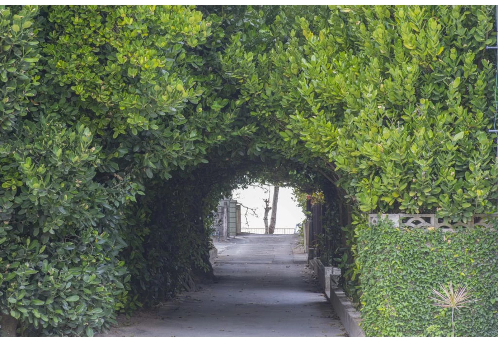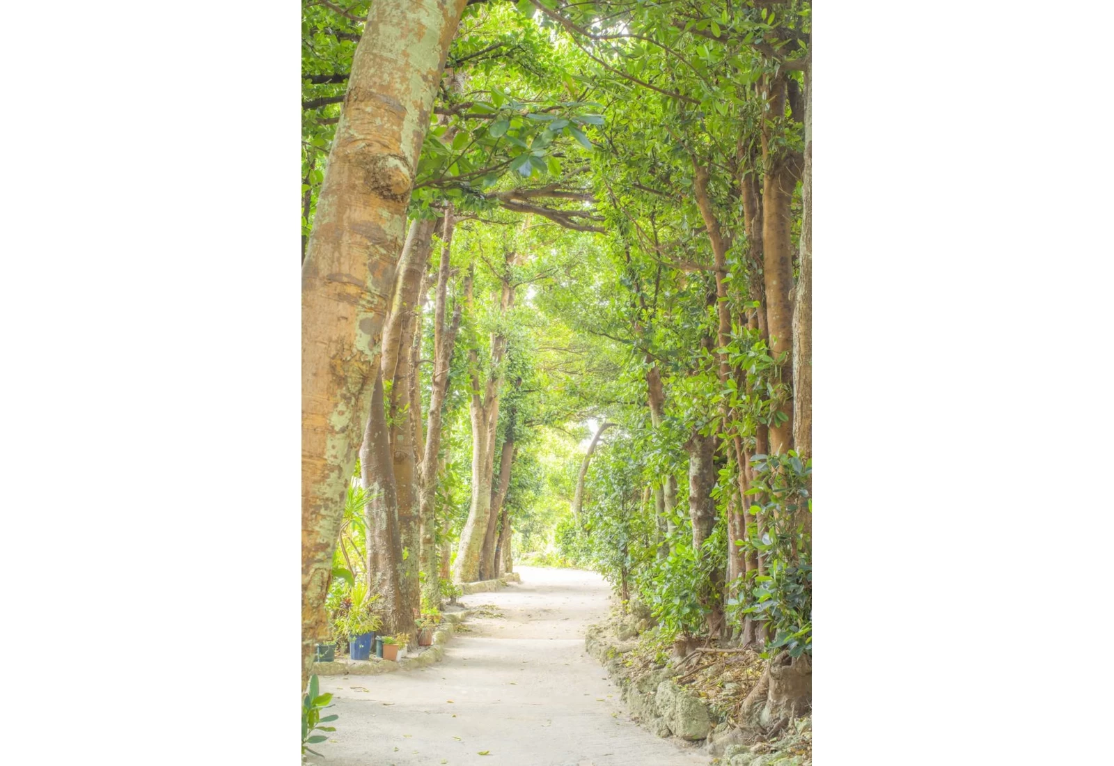 備瀬的福木林蔭道是一條約1公里長的林蔭小徑,福木整齊地種植在民宅周圍,彷彿溫柔地守護著整個聚落。福木在沖繩自古以來便作為防風林使用,而林蔭道周邊的村落,至今仍保留著濃厚的沖繩傳統風景。
