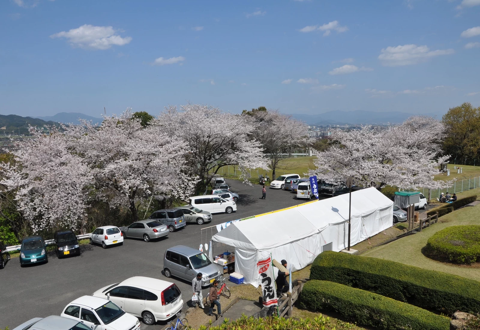 位於鳥栖市的 朝日山公園,座落在海拔 132.9 公尺的小丘上。通往山頂的道路兩旁,春季櫻花盛開,形成一條夢幻的櫻花隧道,因此也被視為「千本櫻」的賞櫻名所。半山腰的停車場附近設有草地廣場,常能看到攜家帶眷前來健行、悠閒散步的遊客身影。