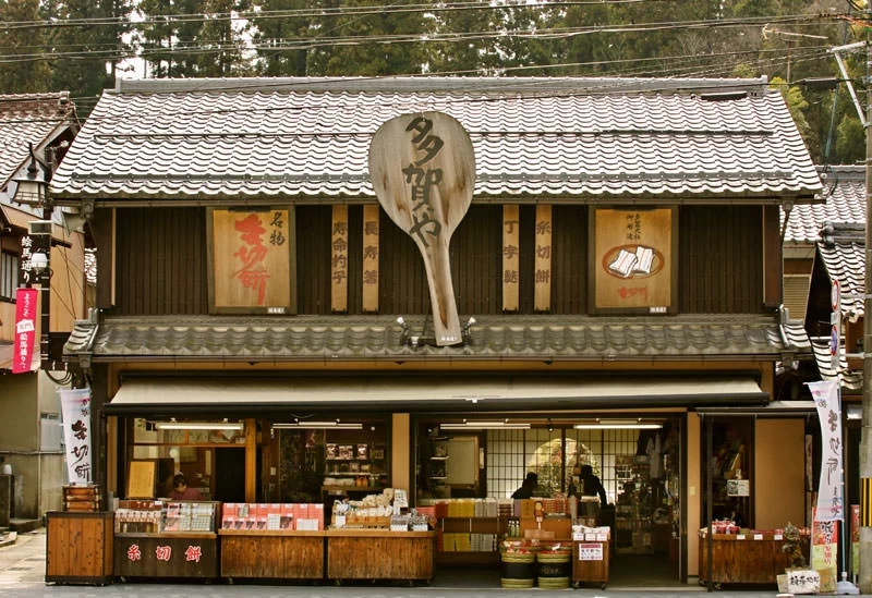 位於近江鐵道多賀線「多賀大社前站」步行約 10 分鐘、多賀大社門前的「多賀や」,以巨大的飯勺為地標,氛圍親切,讓人可以輕鬆進店。在充滿古樸溫暖感的店內,可以品嚐到現做的 「糸切餅」。