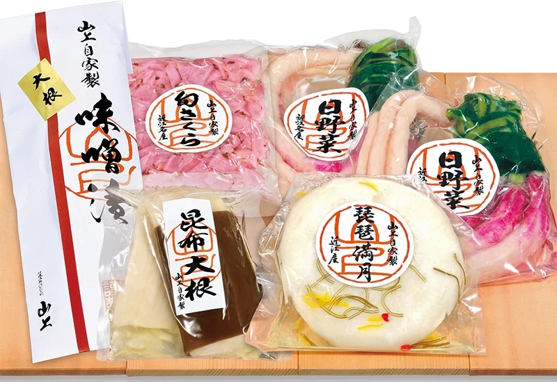 位於滋賀縣湖南市下田的 近江つけもの 山上本店,是一家創業 80 年、重視食材原味的醃漬物店。店內在遵循傳統製法的同時,也採用最新技術,製作並販售 日野菜姿漬(850 日圓)、白菜大葉重疊漬(700 日圓) 等各式魅力醃漬物。作為伴手禮,推薦購買 5 袋的推薦商品組合,或依當季美味醃漬物挑選 6~8 袋的綜合組合(3,000 日圓起)。