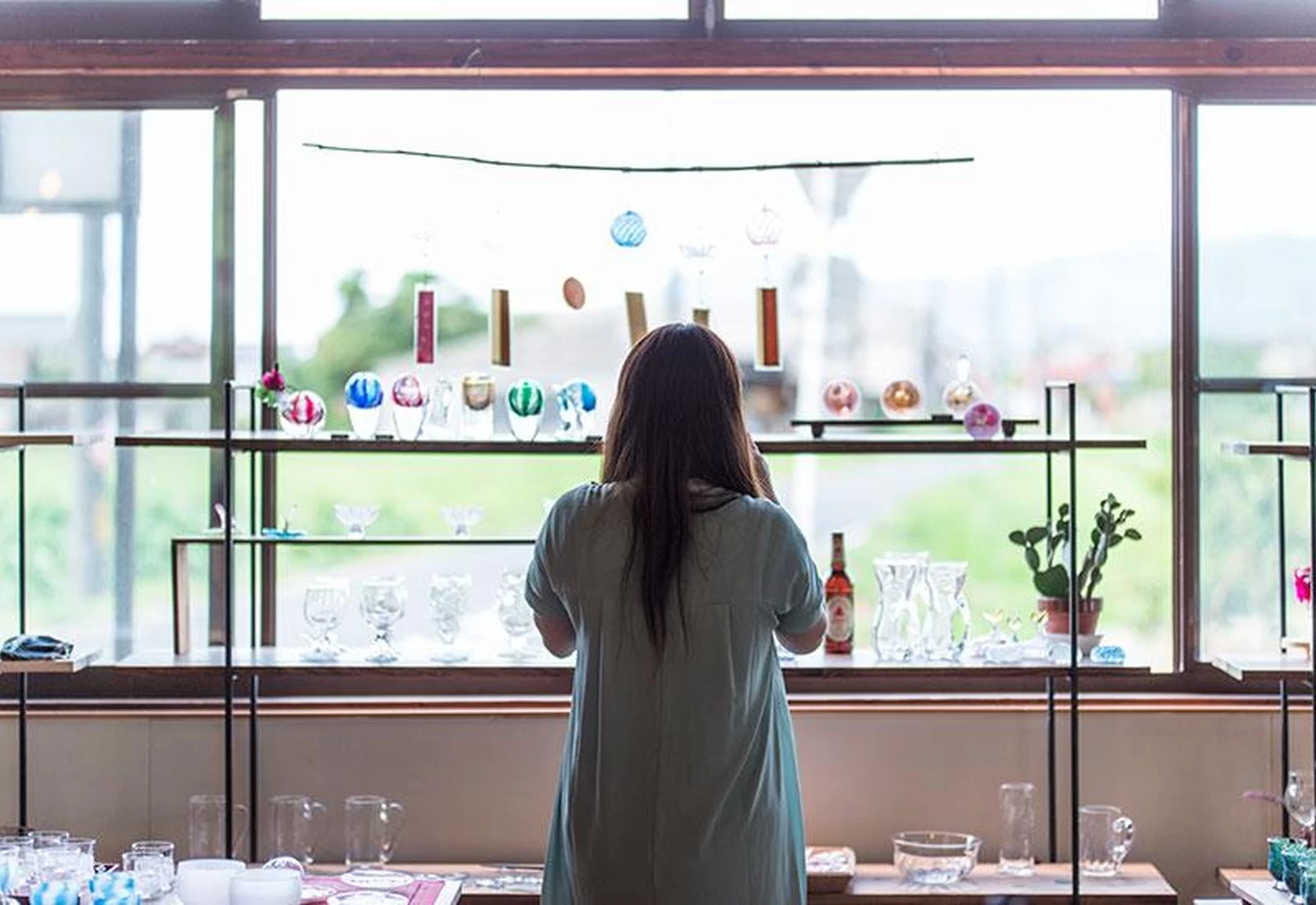 工房內同時設有展示空間,陳列著以纖細美感聞名的玻璃作品,近距離欣賞也十分療癒。完成的作品若不方便帶走,也能請工房協助寄送,和自己的手作一起安心送達家中。