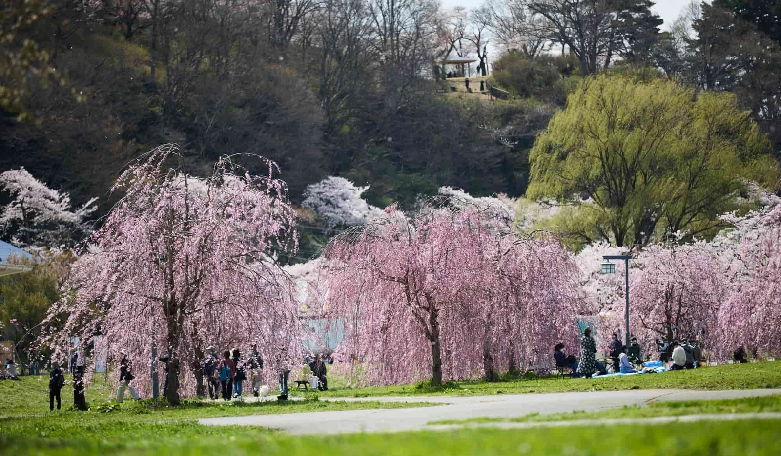 展勝地公園內據說種植了約1萬株櫻花,除了從珊瑚橋起綿延約2公里的櫻花林蔭大道外,園內還可見約150種不同品種的櫻花競相綻放。櫻花大道途中有一座刻著原敬俳號「一山園」的紀念碑,而圍繞著紀念碑盛開的枝垂櫻景色更是壯觀迷人。櫻花大道一側還有寬廣的草地廣場,不僅能在櫻花隧道中漫步,也能從外側欣賞整排櫻花的美麗姿態。