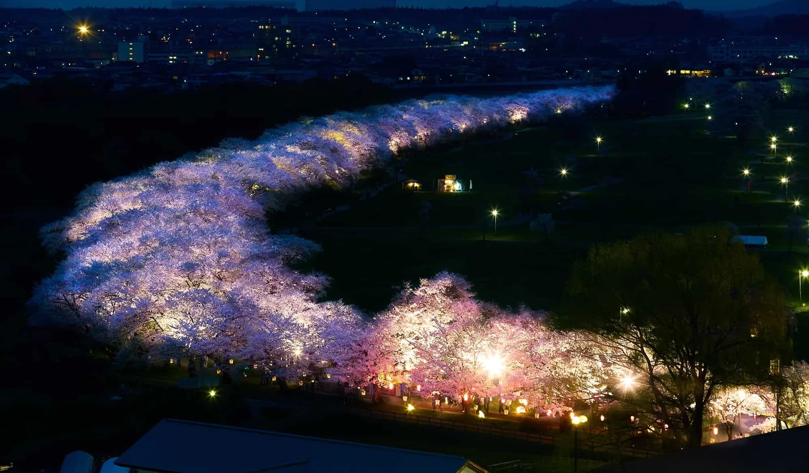 展勝地公園北上川左岸沿著河岸緩緩延伸,綿延約2公里的櫻花林蔭大道隨著河道優雅彎曲。悠然流淌的北上川與盛開櫻花交織出的景色,呈現出充滿北上風情的動人畫面。天氣晴朗的日子裡,櫻花與天空倒映在河面上彼此交融,讓人不禁停下腳步,靜靜沉浸在這份寧靜而美好的時光之中。