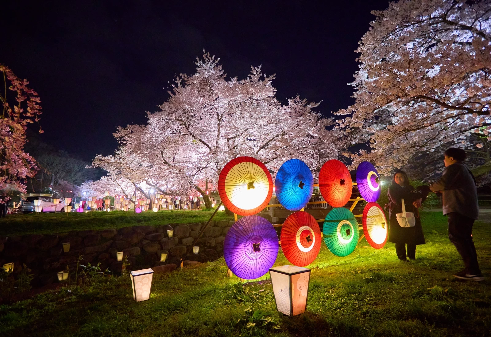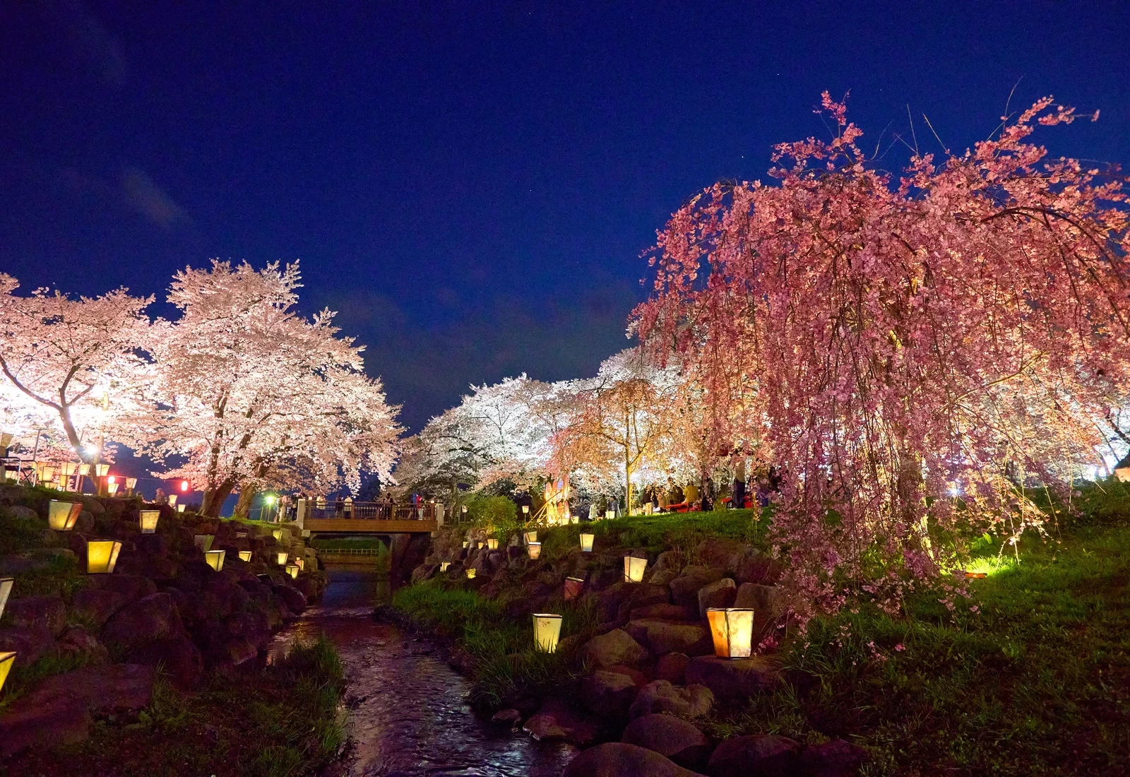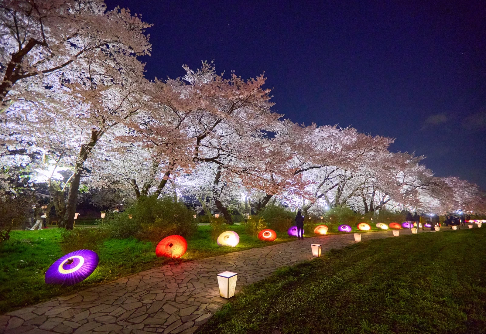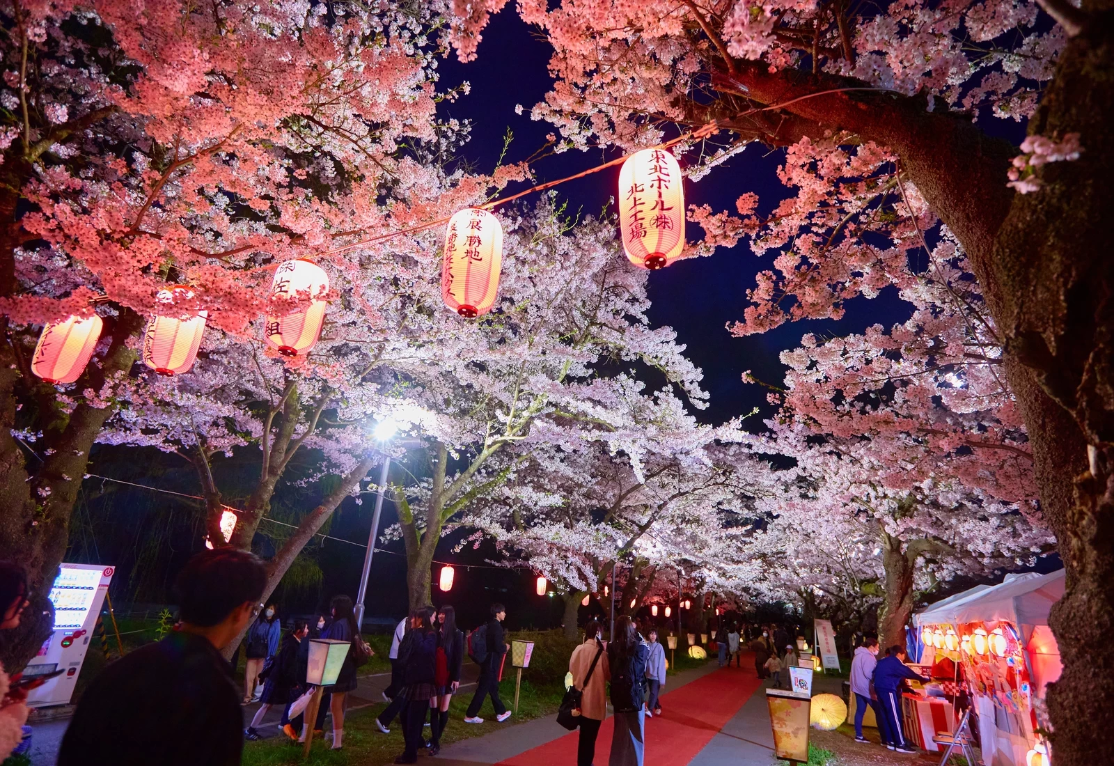 當夜幕降臨時,櫻花林蔭道便展現出與白天截然不同的迷人風情。被燈光點亮的櫻花在夜色中浮現,沿著河岸排列的燈籠柔和地照亮步道,營造出格外浪漫的氛圍。