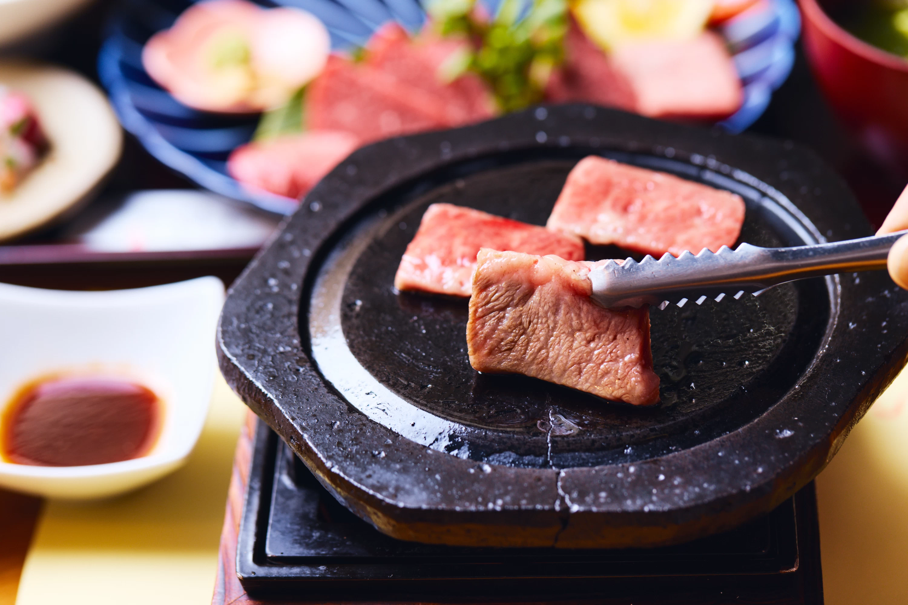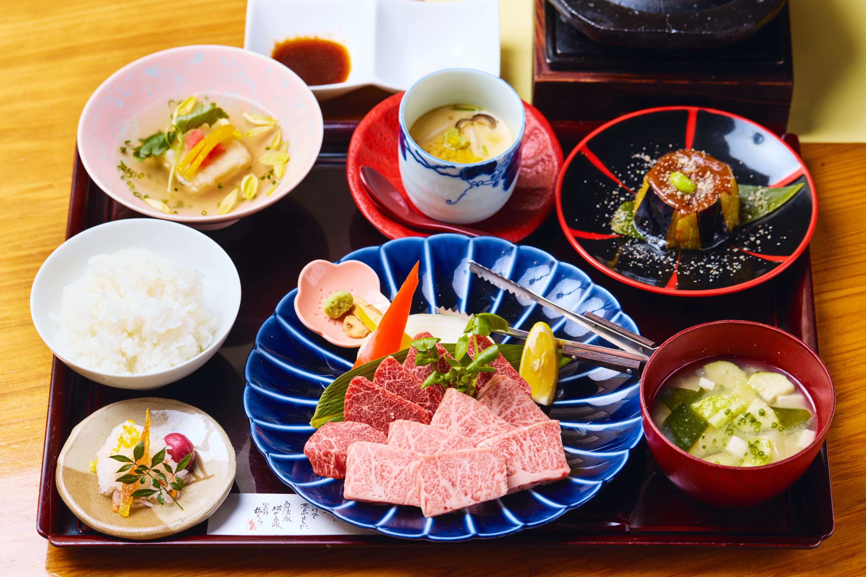 午餐選在能品嚐以阿蘇當季食材為主、充滿季節感鄉土料理的「阿蘇五山梅KURA」。招牌料理是以阿蘇大自然孕育的赤牛製作的「溶岩燒」。具備遠紅外線效果的溶岩石板,將赤牛雖為瘦肉卻帶有甘甜的鮮美滋味充分引出。米飯使用自家栽培、蓬鬆香甜的越光米現煮上桌,隨季節更換的小菜,因為希望能讓客人吃到溫熱的料理,皆是現做提供。名物牡丹餅鹹味恰到好處,使用顆粒感明顯的紅豆餡,甜度收斂不膩。在充滿特別感的同時,又處處可感受到細膩貼心的款待,整體氛圍溫暖而令人懷念。