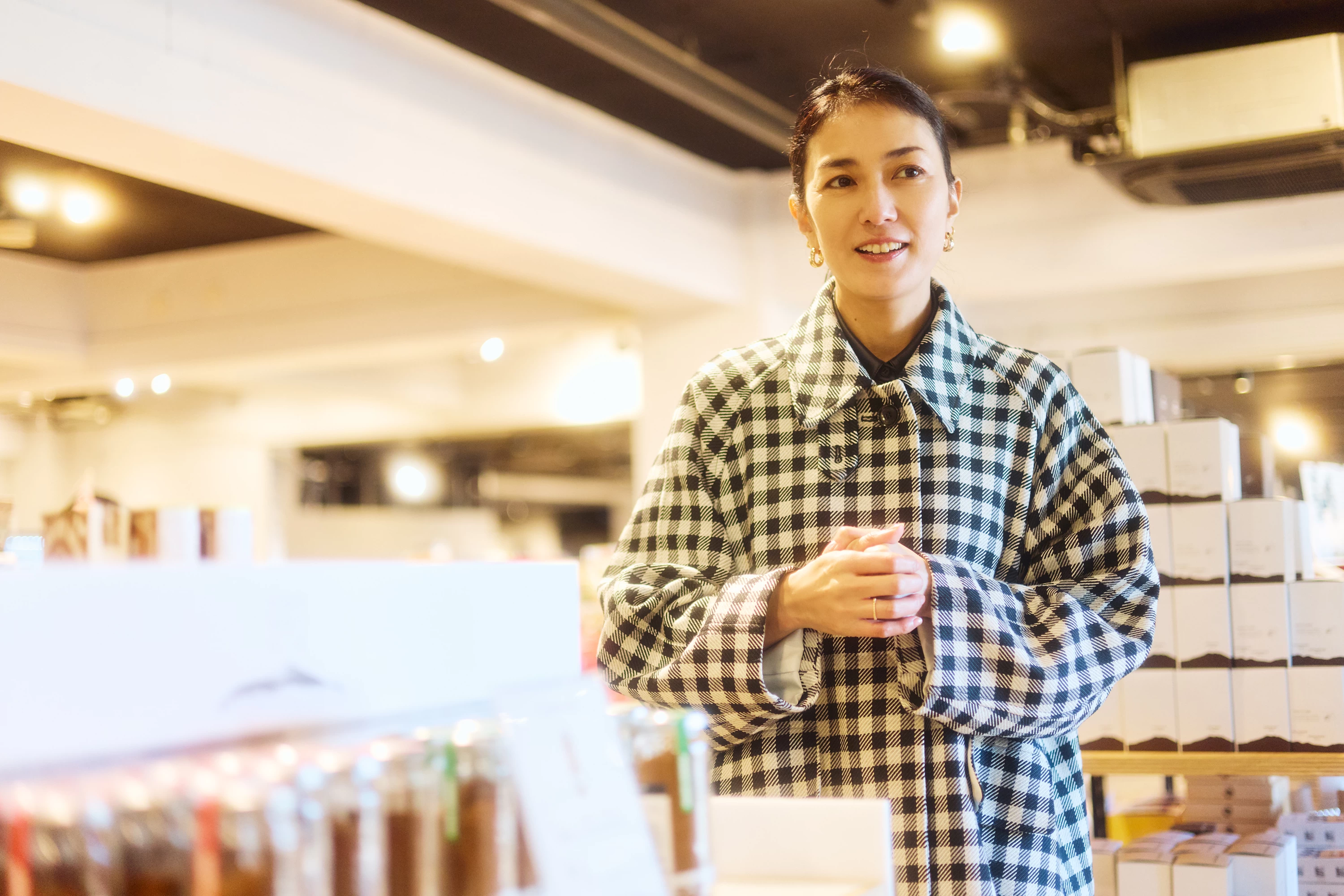 之後前往可一覽 草千里濱美景的「草千里珈琲焙煎所」。店家使用自家烘焙的咖啡豆,細心沖煮出香氣馥郁的一杯咖啡。其中拉花咖啡特別受歡迎,最高曾創下單月三萬杯的成績。板谷小姐則品嚐了使用八女抹茶製作的抹茶拿鐵。店內也陳列了許多原創周邊商品,板谷小姐也樂在其中地挑選伴手禮。