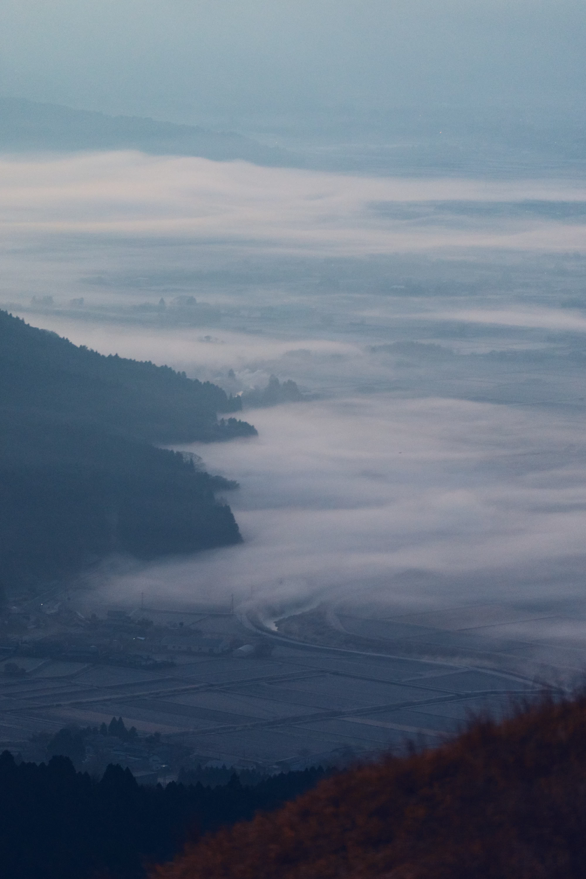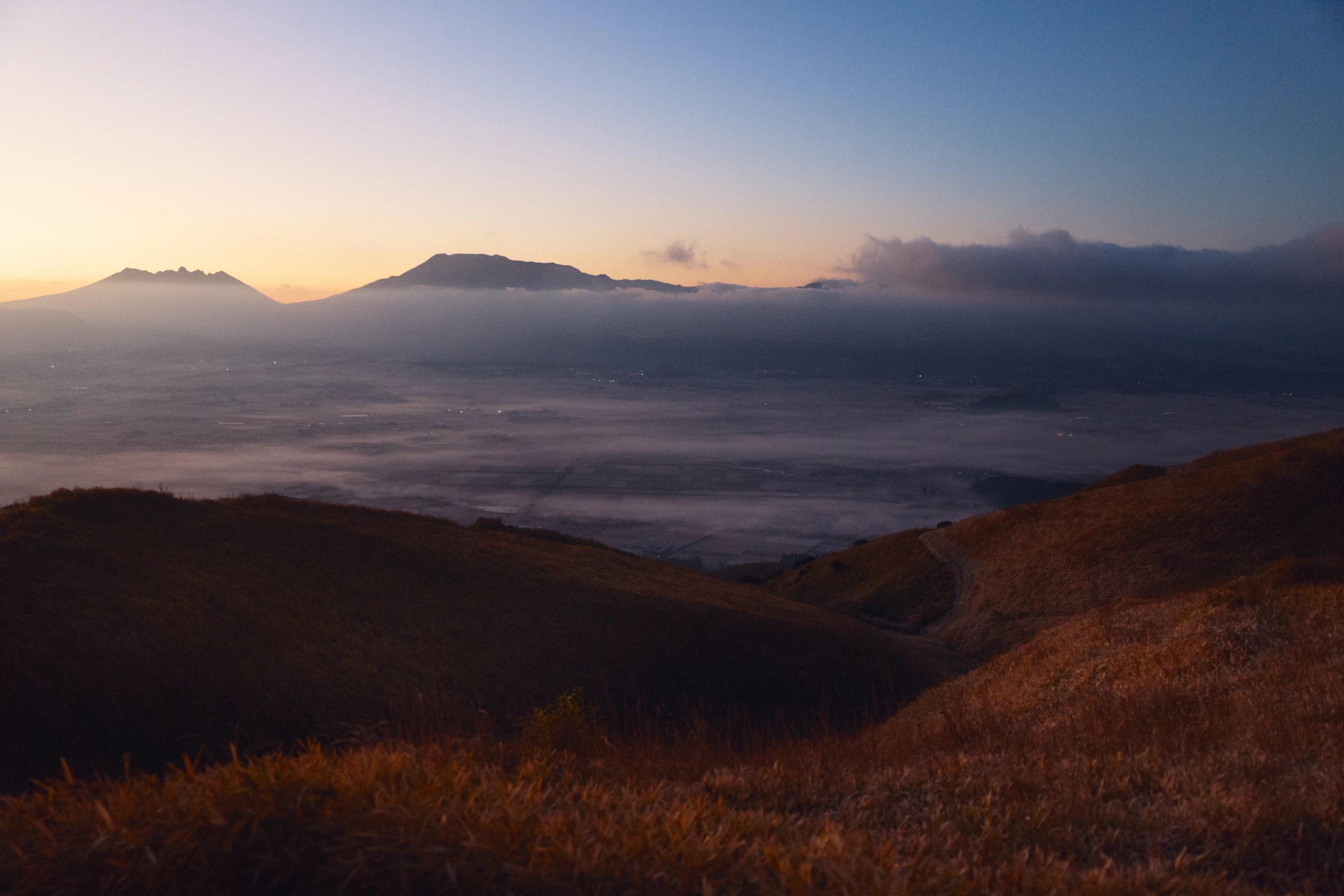 位於北外輪山最高峰的大觀峰,是能將整個破火山口一覽無遺的絕佳展望景點。從這裡眺望阿蘇五岳,山脈的輪廓宛如釋迦牟尼佛橫臥,因此也被稱為「阿蘇的涅槃像」。每到秋冬清晨,這裡更是著名的雲海觀賞地。隨著東方天空逐漸泛白,晨光灑落,阿蘇五岳與雲海一同染上溫柔的橘色,在清澈冷冽的空氣中,能盡情享受一望無際的壯麗景色。不過,天氣轉冷時路面可能會結冰,前往時務必做好萬全準備。