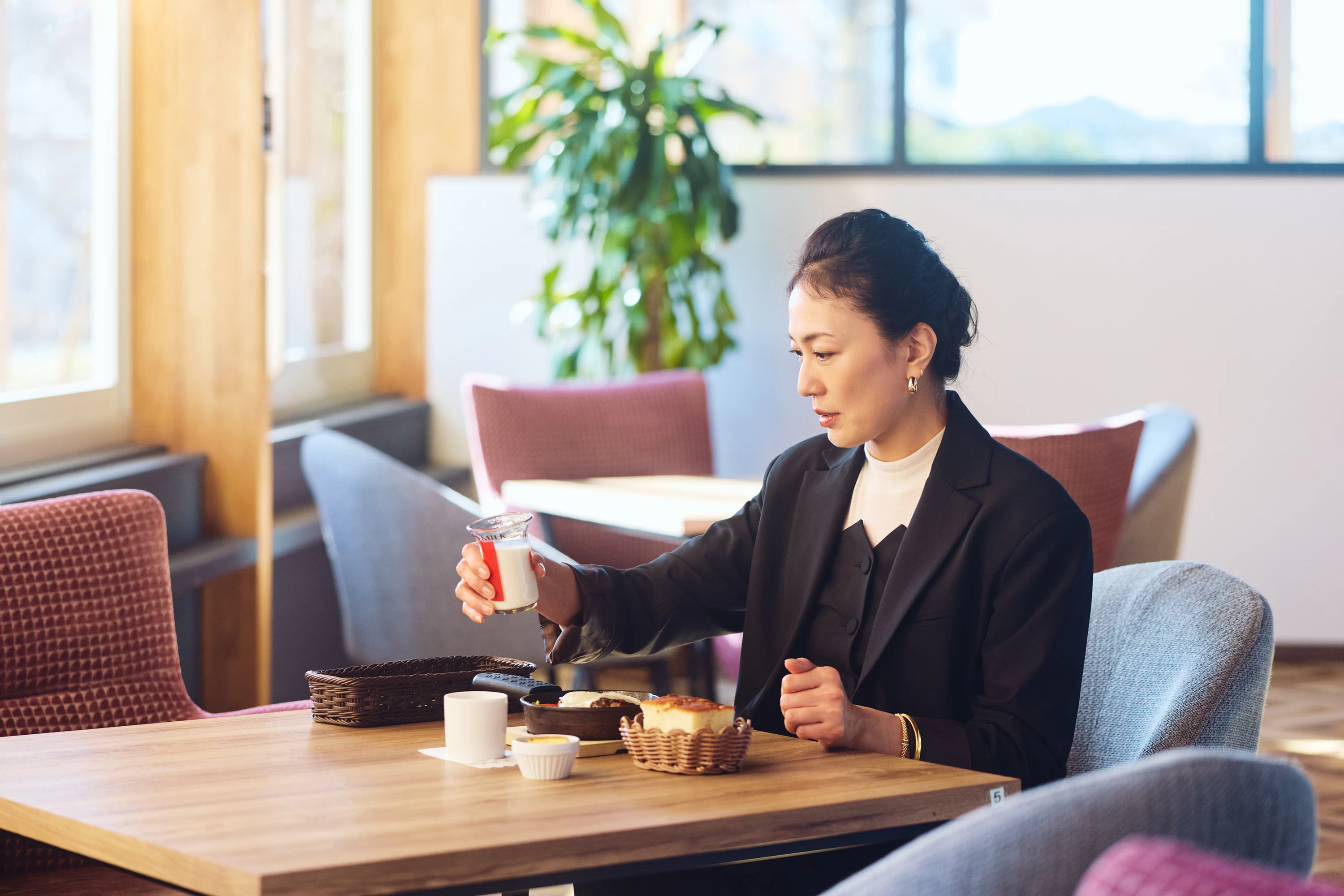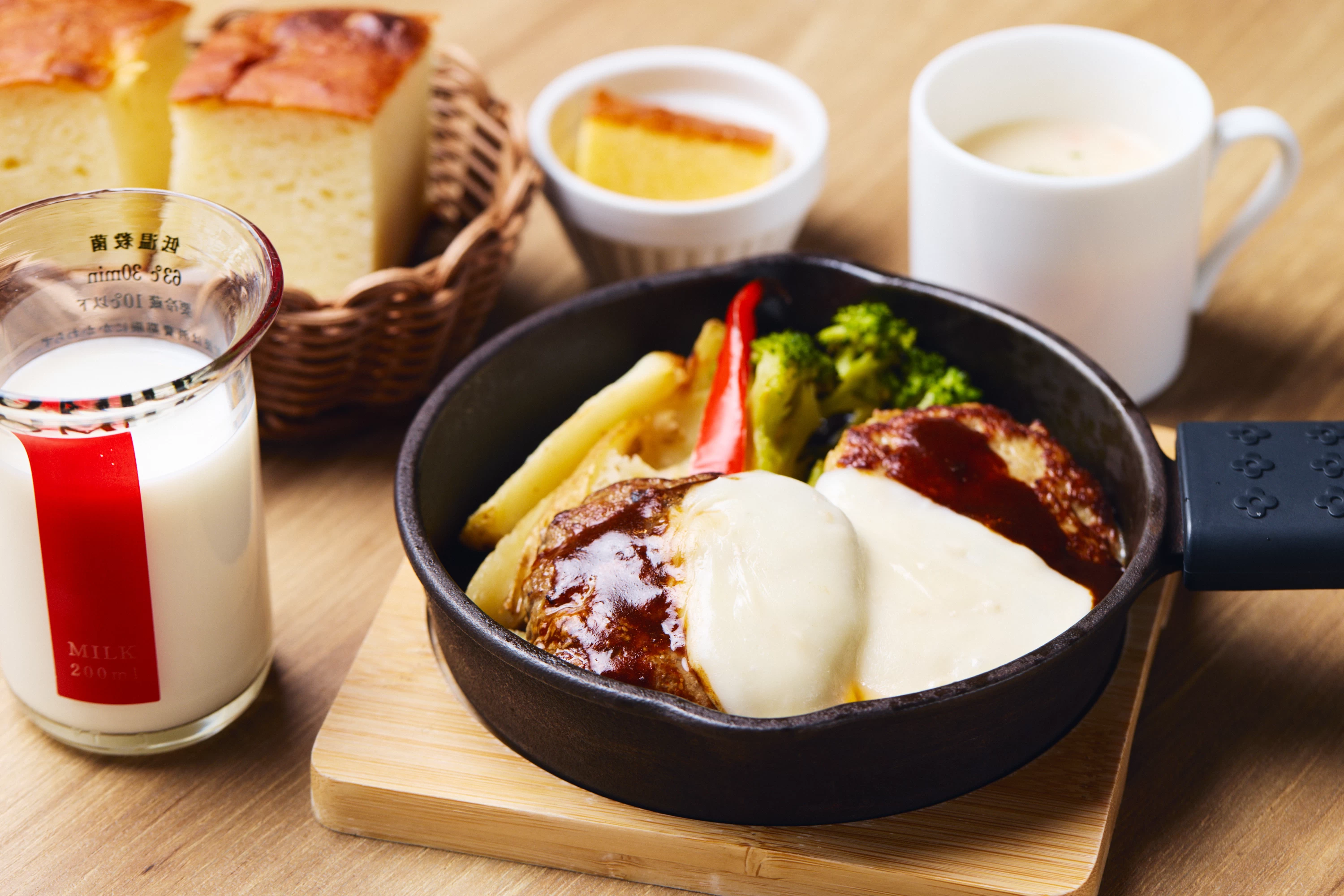 午餐造訪的是結合餐廳、咖啡館與商店的「ASO MILK FACTORY」。是阿蘇具代表性的乳製品,知名度高到在市內的便利商店隨處可見。主打推薦的是使用 100% 赤牛與大和豬肉製作的雙重漢堡排,最後淋上濃郁的洗滌式起司,是一道飽足感十足的佳餚。。板谷小姐大口品嚐後笑著說:「赤牛的風味很濃厚,豬肉則清爽不膩,我也很喜歡豬肉那種淡雅的口感。」一旁的商店區,還能品嚐由營運方阿部牧場製作的霜淇淋與義式冰淇淋,並販售原創甜點、起司與各式伴手禮,讓人忍不住一路逛到最後。